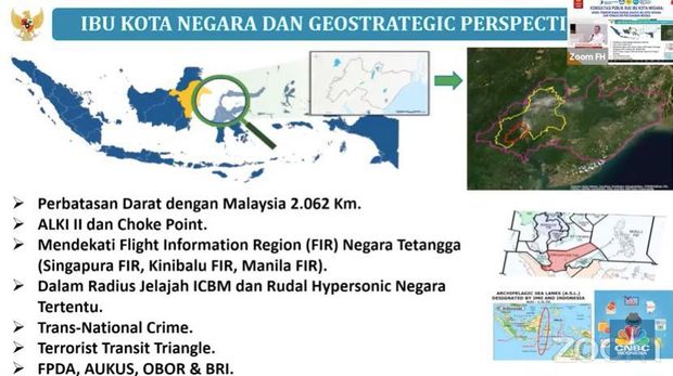 "Yang terakhir, posisi ibu kota negara baru dikelilingi oleh aliansi-aliansi pertahanan, seperti FPDA The Five Power Defence Arrangements Malaysia dan sebagainya, kemudian Aliansi AUKUS Australia, UK, dan USA, dan terdampak dari one belt one road atau OBOR BRI China," papar dia.